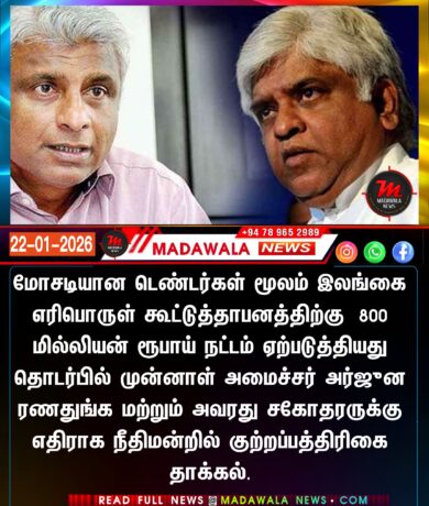 எரிபொருள் கூட்டுத்தாபனத்திற்கு 800 மில்லியன் ரூபாய் நட்டம் ஏற்படுத்தியது தொடர்பில் முன்னாள் அமைச்சர் அர்ஜுன ரணதுங்க மற்றும் அவரது சகோதரருக்கு எதிராக நீதிமன்றில் குற்றப்பத்திரிகை தாக்கல்.முன்னாள் அமைச்சர் அர்ஜுன ரணதுங்க மற்றும் அவரது சகோதரர்…
