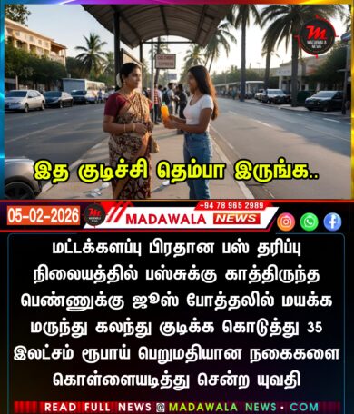 மட்டக்களப்பு பிரதான பஸ் தரிப்பு நிலையத்தில் பஸ்சுக்கு காத்திருந்த பெண்ணுக்கு ஜூஸ் போத்தலில் மயக்க மருந்து கலந்து குடிக்க கொடுத்து 35 இலட்சம் ரூபாய் பெறுமதியான நகைகளை கொள்ளையடித்து சென்ற யுவதி