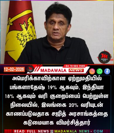 அமெரிக்காவிற்கான ஏற்றுமதியில் பங்களாதேஷ் 19% ஆகவும், இந்தியா 18% ஆகவும் வரி குறைப்பைப் பெற்றுள்ள நிலையில், இலங்கை 20% வரியுடன் காணப்படுவதாக சஜித் அரசாங்கத்தை கடுமையாக விமர்சித்தார்.