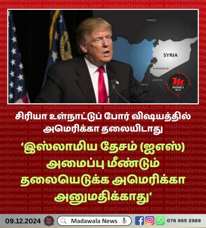 சிரியாவை கிளா்ச்சியாளா்கள் கைப்பற்றியுள்ள நிலையில் சிரியா உள்நாட்டுப் போர் விஷயத்தில் அமெரிக்கா தலையிடாது என்று அந்நாட்டு ஜனாதிபதியாகத் தோ்வு செய்யப்பட்டுள்ள டொனால்ட் ட்ரம்ப் தெரிவித்துள்ளார்.