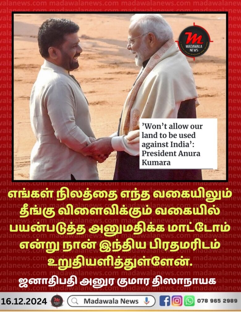 இலங்கை ஜனாதிபதி அனுரகுமார திஸாநாயக்க, “எங்கள் நிலத்தை எந்த வகையிலும் தீங்கு விளைவிக்கும் வகையில் பயன்படுத்த அனுமதிக்க மாட்டோம் என்று நான் இந்திய பிரதமரிடம் உறுதியளித்துள்ளேன்.இந்தியாவின் நலன் கருதி, இந்தியாவுடனான ஒத்துழைப்பு நிச்சயமாக செழிக்கும், மேலும் இந்தியாவுக்கான எங்கள் தொடர் ஆதரவை நான் உறுதிப்படுத்த விரும்புகிறேன்.