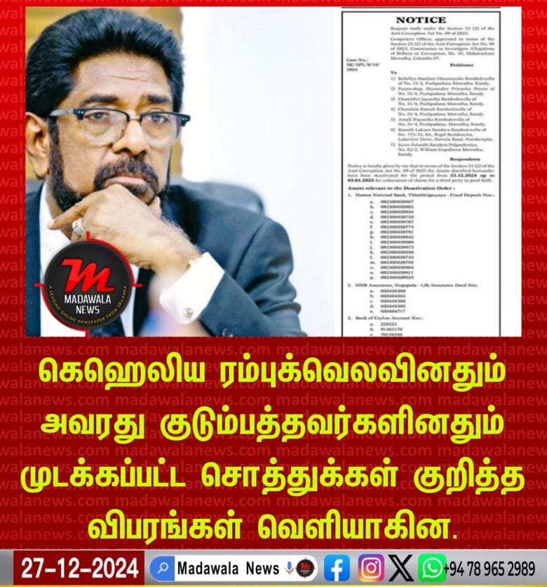 முன்னாள் அமைச்சர் கெஹெலிய ரம்புக்வெலவினதும் அவரது குடும்பத்தவர்களினதும் முடக்கப்பட்ட சொத்துக்கள் குறித்த விபரங்கள் வெளியாகியுள்ளன.