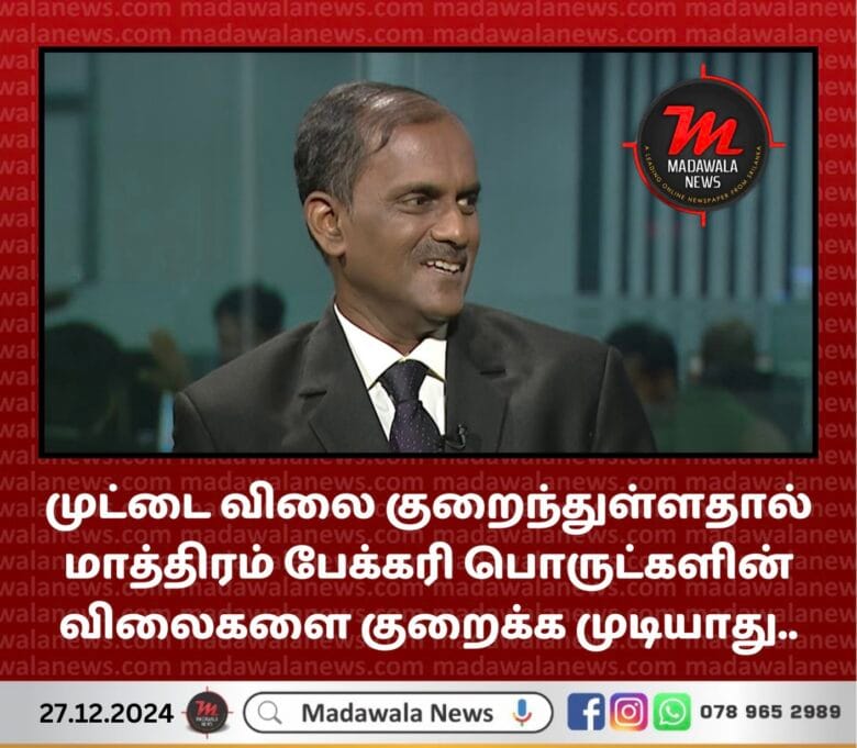 60 ரூபாய் வரை முட்டை விலை உயர்ந்த நிலையில் தற்போது 25 ரூபாய் வரை குறைந்துள்ள போதும் அதனால் மாத்திரம் பேக்கரி பொருட்களின் விலைகளை குறைக்க முடியாது என பேக்கரி உற்பத்தியாளர்கள் சங்கத்தின் தலைவர் கே என் ஜயவர்தன குறிப்பிட்டார்.