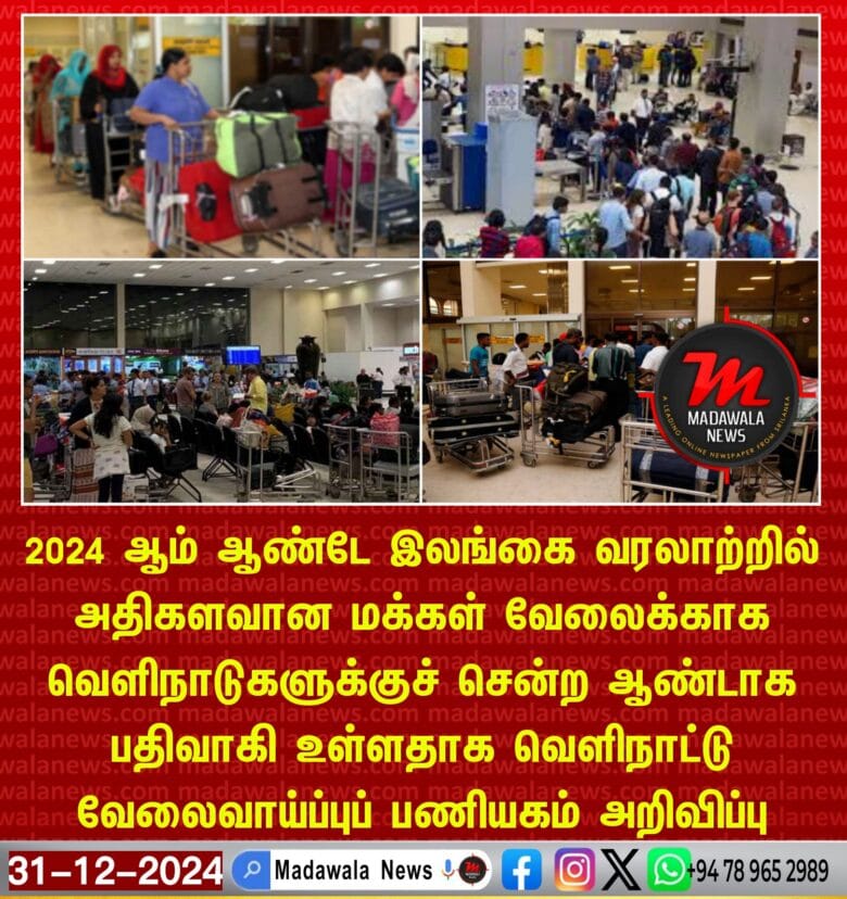 2024 ஆம் ஆண்டே இலங்கை வரலாற்றில் அதிகளவானோர் வேலைக்காக வெளிநாடுகளுக்குச் சென்ற ஆண்டாக பதிவாகி உள்ளதாக வெளிநாட்டு வேலைவாய்ப்புப் பணியகம் அறிவிப்பு