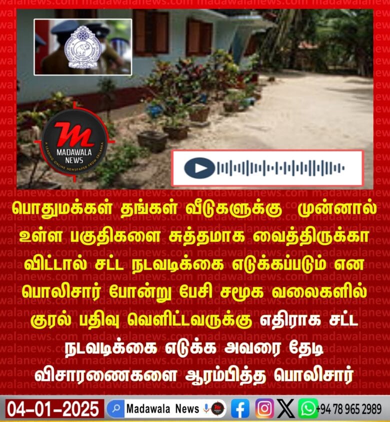 பொதுமக்கள் தங்கள் வீடுகளுக்கு முன்னால் உள்ள பகுதிகளை சுத்தமாக வைத்திருக்காவிட்டால் சட்ட நடவடிக்கை எடுக்கப்படும் என பொலிசார் போன்று பேசி சமூக வலைகளில் குரல் பதிவு வெளிட்டவருக்கு எதிராக சட்ட நடவடிக்கை எடுக்க அவரை தேடி விசாரணைகளை ஆரம்பித்த பொலிசார்