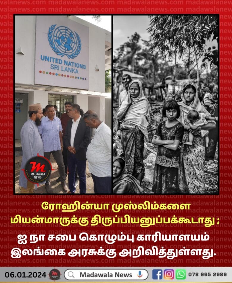 ரோஹின்யா முஸ்லிம்கள் மியன்மாருக்கு திருப்பியனுப்பக்கூடாது என ஐ நா சபை கொழும்பு காரியாளயம் இலங்கை அரசுக்கு அறிவித்துள்ளது.