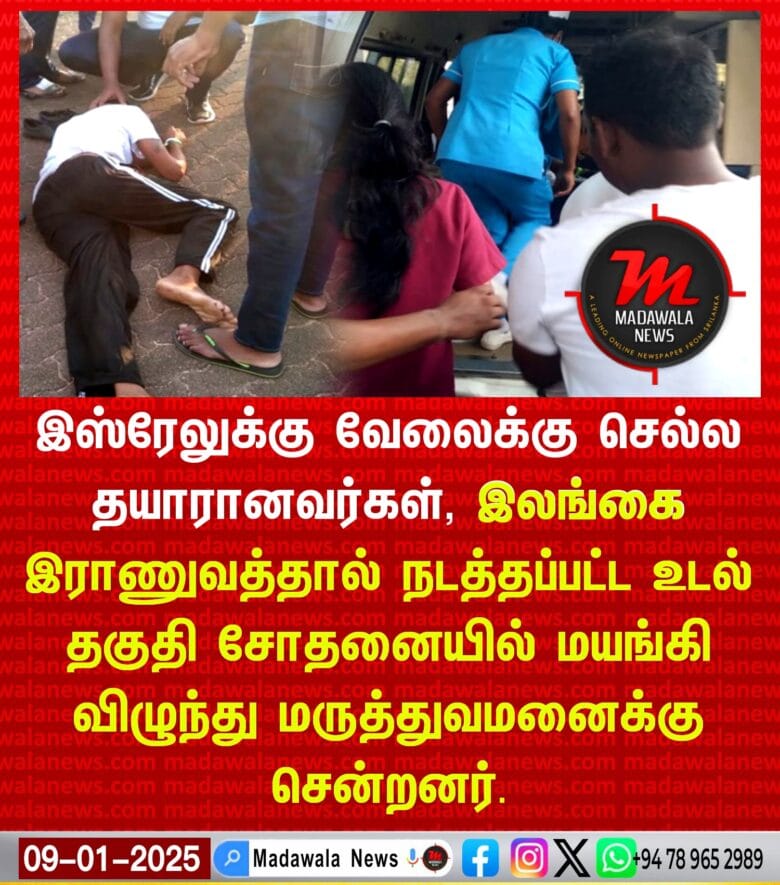 இஸ்ரேலுக்கு வேலைக்கு செல்ல தயாரானவர்கள், இலங்கை இராணுவத்தால் நடத்தப்பட்ட உடல் தகுதி சோதனையில் மயங்கி விழுந்து மருத்துவமனைக்கு சென்றனர்.