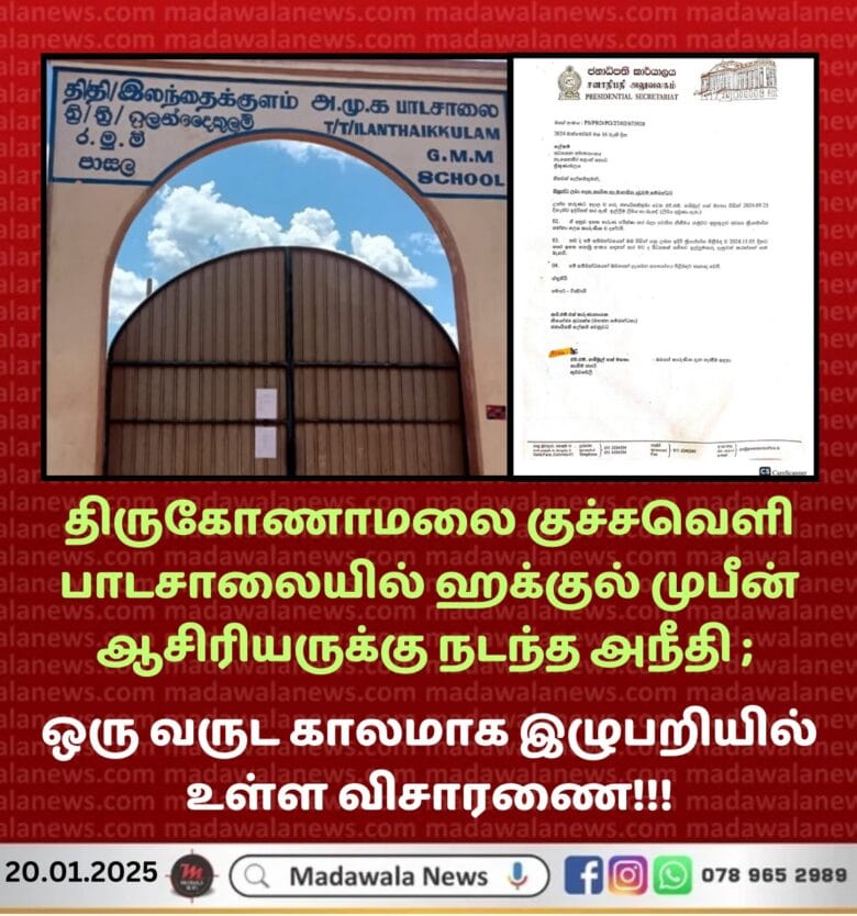 திருகோணாமலை குச்சவெளி பாடசாலையில் ஹக்குல் முபீன் ஆசிரியருக்கு நடந்த அநீதி ; ஒரு வருட காலமாக இழுபறியில் உள்ள விசாரணை!!!