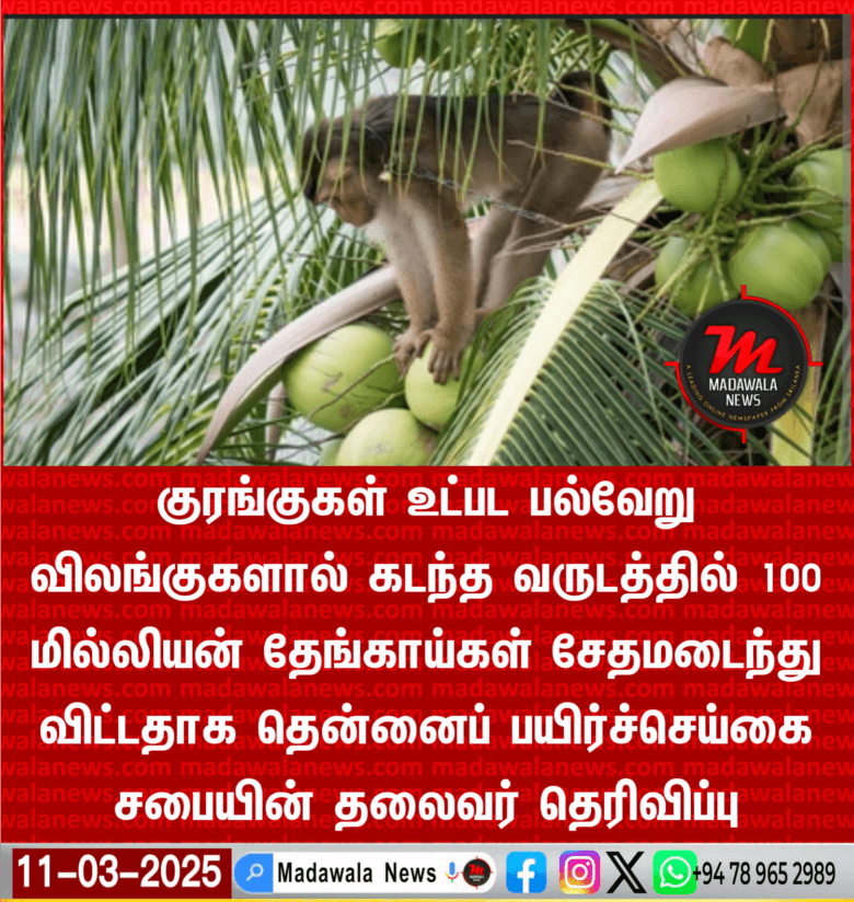 குரங்குகள் உட்பட பல்வேறு விலங்குகளால் கடந்த வருடத்தில் 100 மில்லியன் தேங்காய்கள் சேதமடைந்து விட்டதாக தென்னைப் பயிர்ச்செய்கை சபையின் தலைவர் தெரிவிப்பு  .