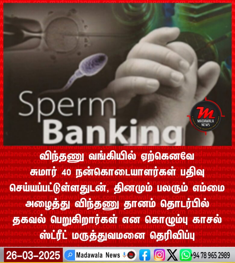 விந்தணு வங்கியில் ஏற்கெனவே சுமார் 40 நன்கொடையாளர்கள் பதிவு செய்யப்பட்டுள்ளதுடன், தினமும் பலரும் எம்மை அழைத்து விந்தணு தானம் தொடர்பில் தகவல் பெறுகிறார்கள் என கொழும்பு காசல் ஸ்ட்ரீட் மருத்துவமனை தெரிவிப்பு