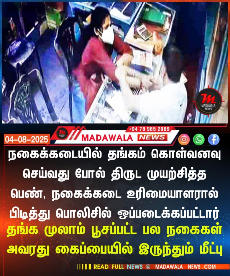 நகைக்கடையில் தங்கம் கொள்வனவு செய்வது போல் திருட முயற்சித்த பெண், நகைக்கடை உரிமையாளரால் பிடித்து பொலிசில் ஒப்படைக்கப் பட்டார்.