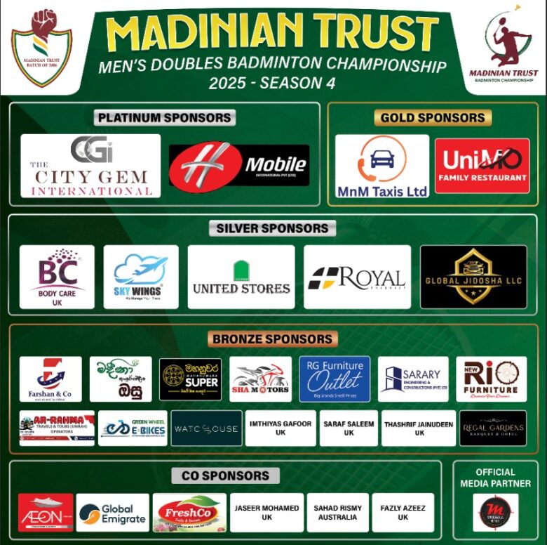 இந்த சேவைகளை முன்னெடுக்க வருடாந்த மதீனியன் டிரஸ்ட் பேட்மிண்டன் சாம்பியன்ஷிப் – சீசன் 4 வரும் செப்டம்பர் 6, 2025 அன்று Action Indoor, மடவலையில் நடைபெறுகிறது.