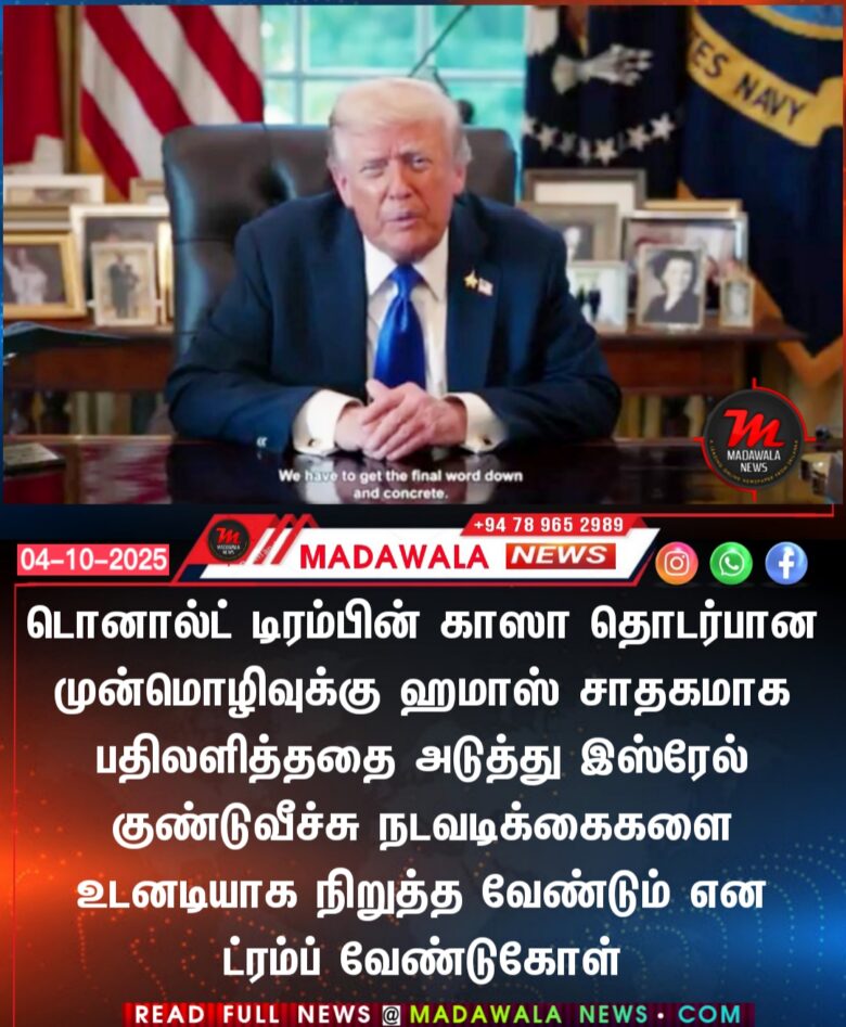 டொனால்ட் டிரம்பின் காஸா தொடர்பான முன்மொழிவுக்கு ஹமாஸ் சாதகமாக பதிலளித்ததை அடுத்து இஸ்ரேல் குண்டுவீச்சு நடவடிக்கைகளை உடனடியாக நிறுத்த வேண்டும் என ட்ரம்ப் வேண்டுகோள்