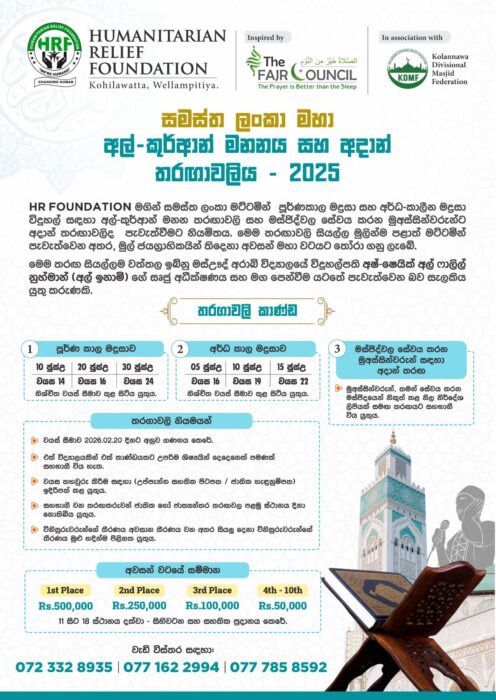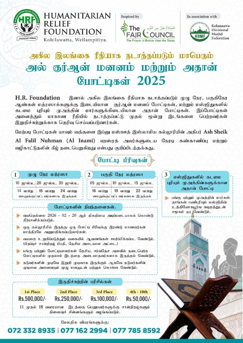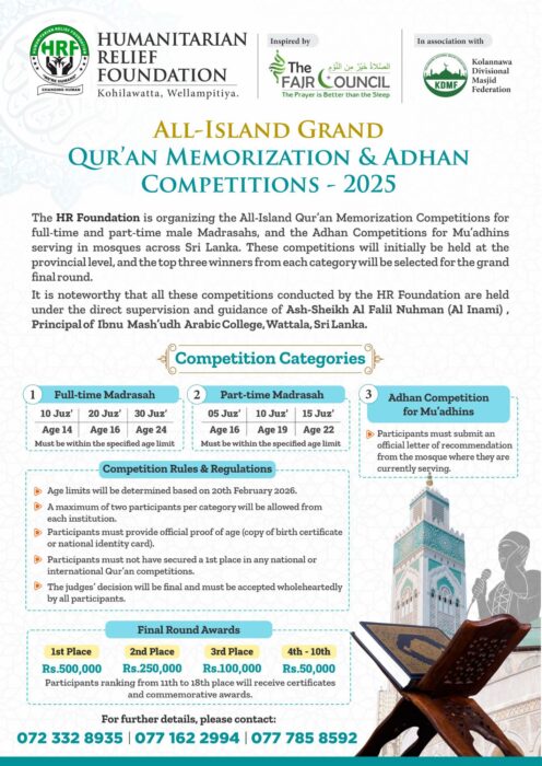 அகில இலங்கை ரீதியாக நடாத்தப்படும் மாபெரும் அல் குர்ஆன் மனனம் மற்றும் அதான் போட்டிகள் – 2025