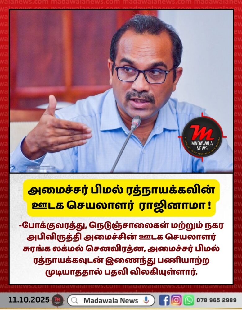 அமைச்சர் பிமல் ரத்நாயக்கவின் ஊடக செயலாளர் தனது பதவியை ராஜினாமா செய்துள்ளார்.