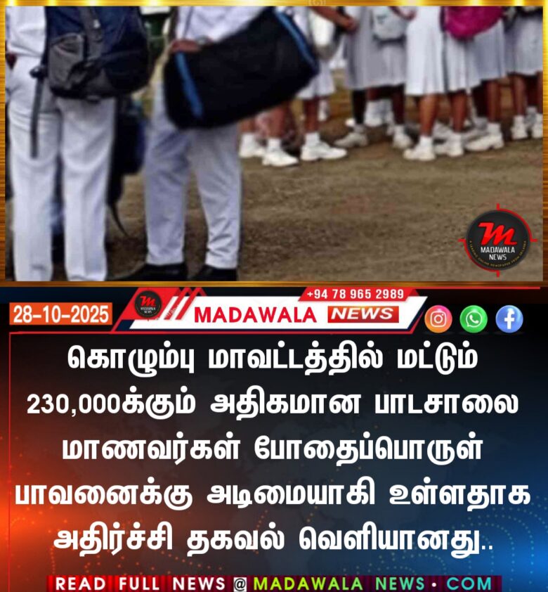 கொழும்பு மாவட்டத்தில் மட்டும் 230,000க்கும் அதிகமான பாடசாலை மாணவர்கள் போதைப்பொருள் பாவனைக்கு அடிமையாகி உள்ளதாக அதிர்ச்சி தகவல் வெளியானது..