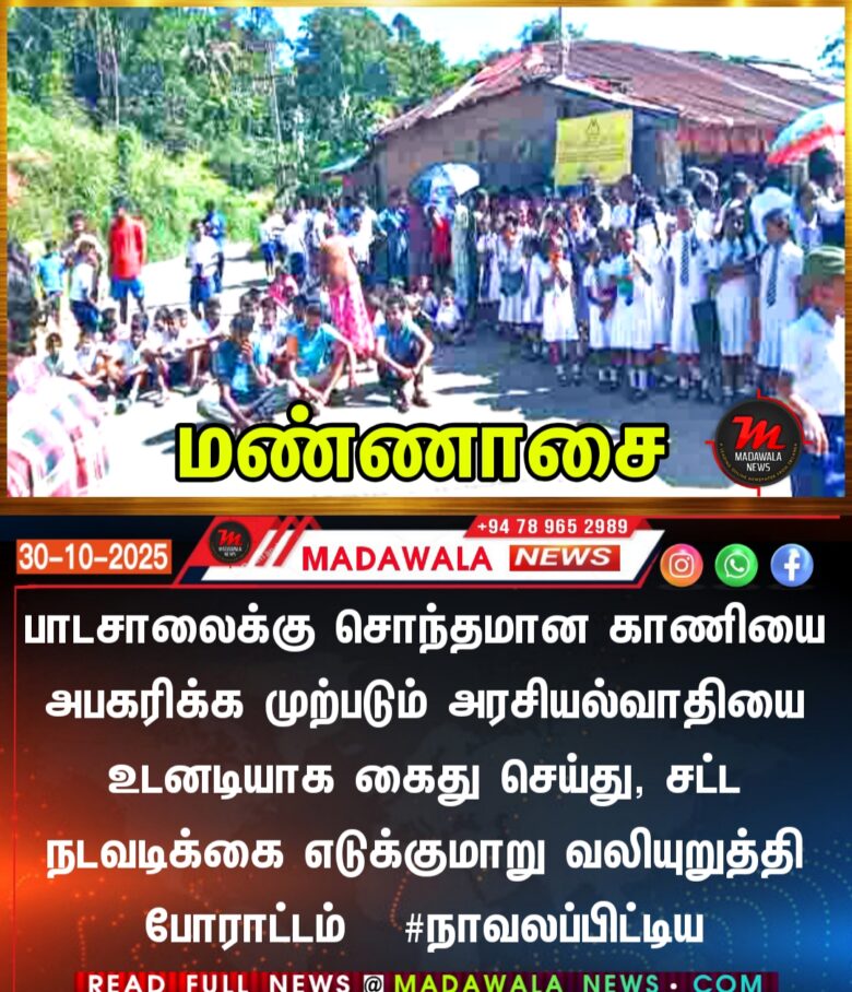பாடசாலைக்கு சொந்தமான காணியை அபகரிக்க முற்படும் அரசியல்வாதியை உடனடியாக கைது செய்து, சட்ட நடவடிக்கை எடுக்குமாறு வலியுறுத்தி போராட்டம் #நாவலப்பிட்டிய
