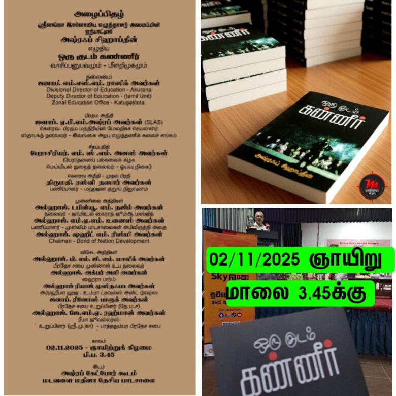 ஸ்ரீலங்கா இஸ்லாமிய எழுத்தாளர் அமைப்பின் ஏற்பாட்டில் அஷ்ரஃப் சிஹாப்தீன் எழுதிய ஒரு குடம் கண்ணீர் நூல் வாசிப்பனுபவமும் -மீளறிமுகமும் எதிர்வரும் 02.11.2025 (நாளை) ஞாயிறு அன்று மாலை 3.45க்கு மடவளை மதீனா தேசிய பாடசாலை அஷ்ரப் கேட்போர் கூடத்தில் இடம்பெறவுள்ளது.