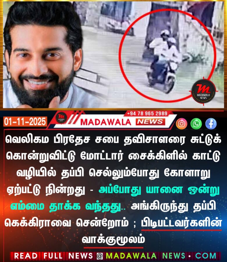 வெலிகம பிரதேச சபை தவிசாளரை சுட்டுக் கொன்றுவிட்டு மோட்டார் சைக்கிளில் காட்டு வழியில் தப்பி செல்லும்போது கோளாறு ஏற்பட்டு நின்றது – அப்போது யானை ஒன்று எம்மை தாக்க வந்தது.. அங்கிருந்து தப்பி கெக்கிராவை சென்றோம் ; பிடிபட்டவர்களின் வாக்குமூலம்
