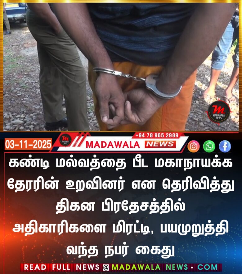 கண்டி மல்வத்தை பீட மகாநாயக்க தேரரின் உறவினர் என தெரிவித்து திகன பிரதேசத்தில் அதிகாரிகளை மிரட்டி, பயமுறுத்தி வந்த நபர் கைது