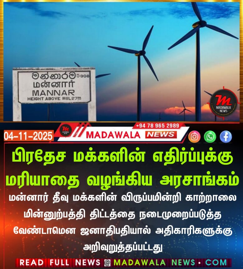 பிரதேச மக்களின் எதிர்ப்புக்கு மரியாதை வழங்கிய அரசாங்கம் – மன்னார் தீவு மக்களின் விருப்பமின்றி காற்றாலை மின்னுற்பத்தி திட்டத்தை நடைமுறைப்படுத்த வேண்டாமென ஜனாதிபதியால் அதிகாரிகளுக்கு அறிவுறுத்தப்பட்டது.