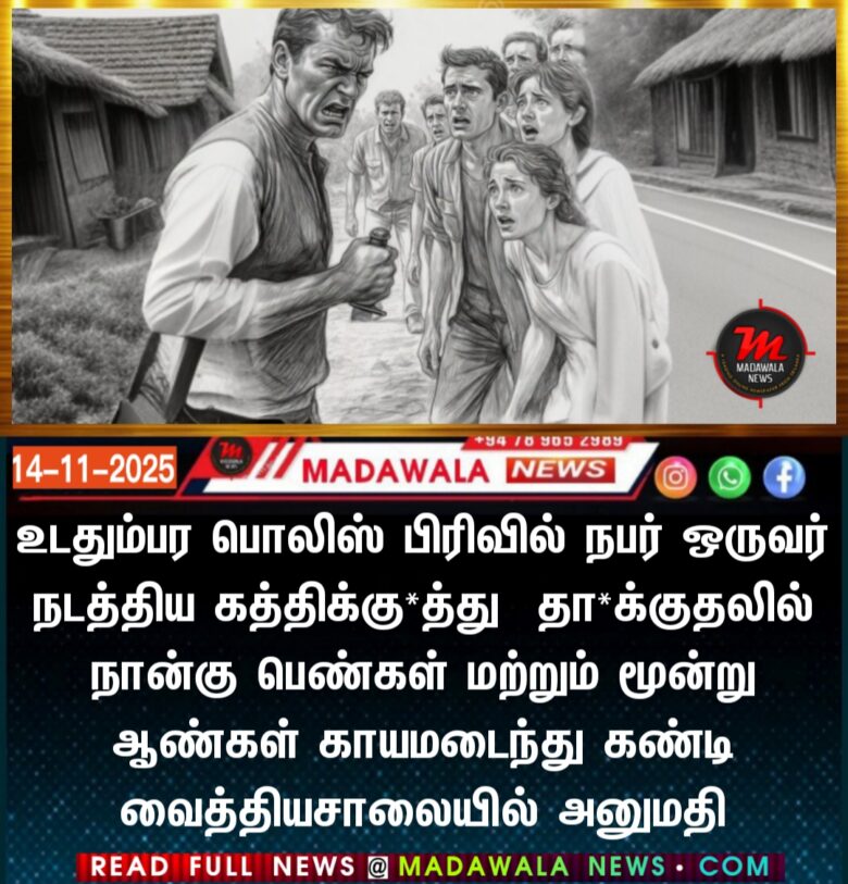 உடதும்பர பொலிஸ் பிரிவில் நபர் ஒருவர் நடத்திய கத்திக்கு*த்து தா*க்குதலில் நான்கு பெண்கள் மற்றும் மூன்று ஆண்கள் காயமடைந்து கண்டி வைத்தியசாலையில் அனுமதி