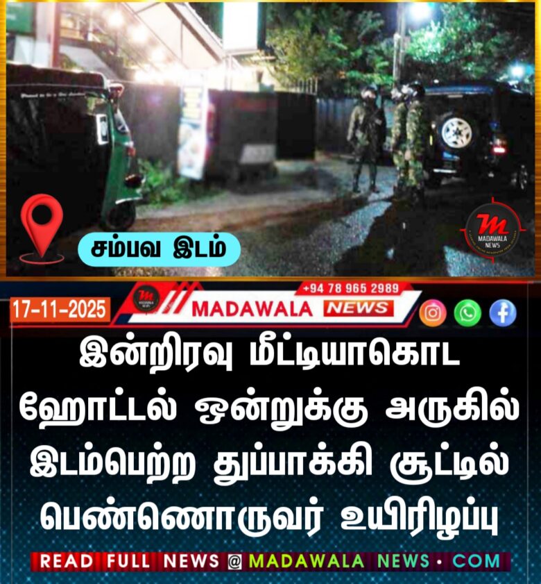 இன்றிரவு மீட்டியாகொட ஹோட்டல் ஒன்றுக்கு அருகில் இடம்பெற்ற துப்பாக்கி சூட்டில் பெண்ணொருவர் உயிரிழப்பு