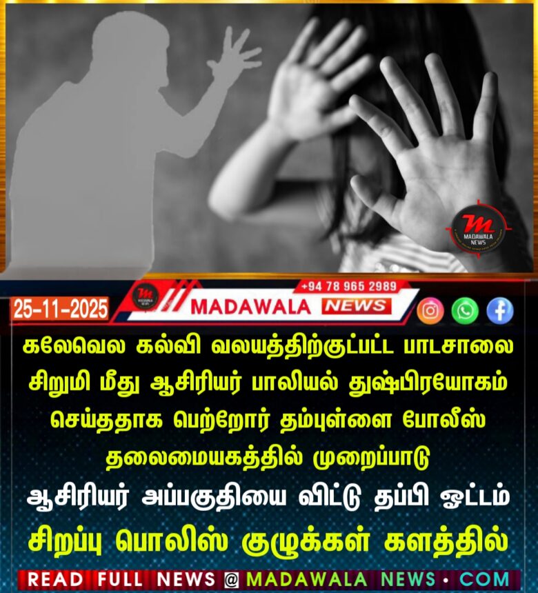 கலேவெல கல்வி வலயத்திற்குட்பட்ட பாடசாலை சிறுமி மீது ஆசிரியர் பாலியல் துஷ்பிரயோகம் செய்ததாக பெற்றோர் தம்புள்ளை போலீஸ் தலைமையகத்தில் முறைப்பாடு – ஆசிரியர் அப்பகுதியை விட்டு தப்பி ஓட்டம் – சிறப்பு பொலிஸ் குழுக்கள் களத்தில்