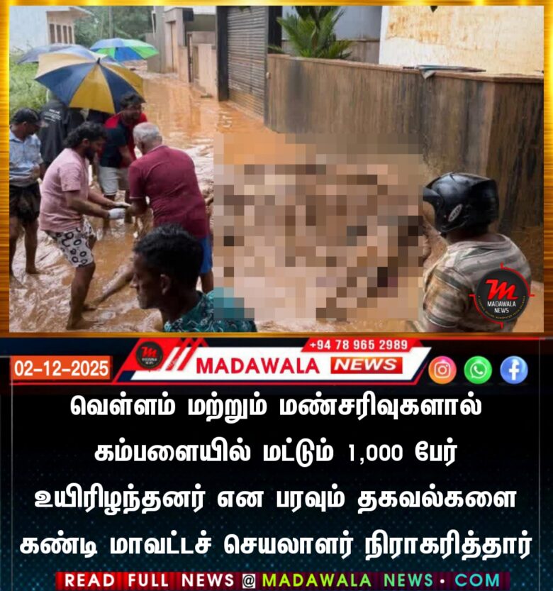 வெள்ளம் மற்றும் மண்சரிவுகளால் கம்பளையில் மட்டும் 1,000 பேர் உயிரிழந்தனர் என பரவும் தகவல்களை கண்டி மாவட்டச் செயலாளர் நிராகரித்தார்.