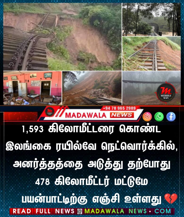1,593 கிலோமீட்டரை கொண்ட இலங்கை ரயில்வே நெட்வொர்க்கில், அனர்த்தத்தை அடுத்து தற்போது 478 கிலோமீட்டர் மட்டுமே பயன்பாட்டிற்கு எஞ்சி உள்ளது