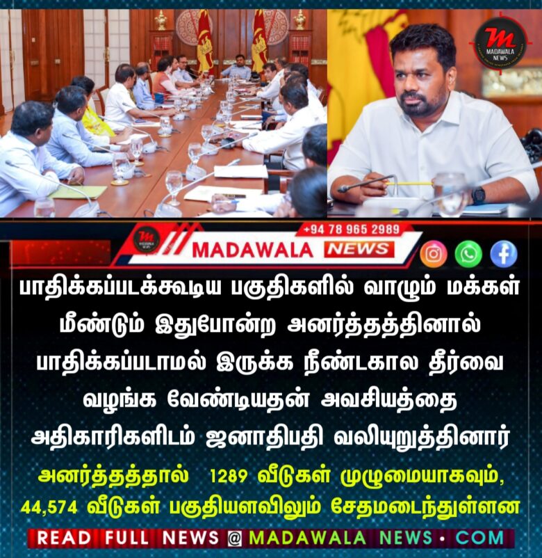 சீரற்ற காலநிலை காரணமாக முழுமையாகவும் பகுதியளவிலும் சேதமடைந்த வீடுகளை உரிய முறைமையின்படி அடையாளம் காணுமாறும், இழப்பீடு வழங்குவதற்குத் தேவையான துல்லியமான தரவுகளை திறம்படப் பெறுவதற்கான விசேட பொறிமுறையை உருவாக்கவும் வீடமைப்பு அபிவிருத்தி அதிகாரசபை அதிகாரிகளுக்கு ஜனாதிபதி அநுரகுமார திசாநாயக்க பணிப்புரை விடுத்தார்.