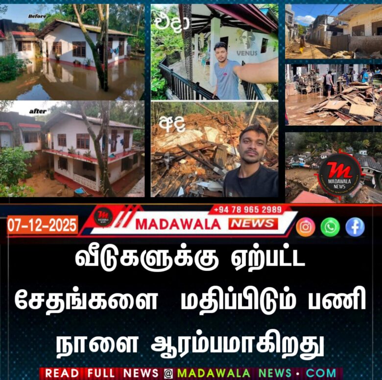 அனர்த்தத்தால் பாதிக்கப்பட்ட வீடுகளுக்கு ஏற்பட்ட சேதங்களை மதிப்பிடும் பணி நாளை ஆரம்பமகிறது.