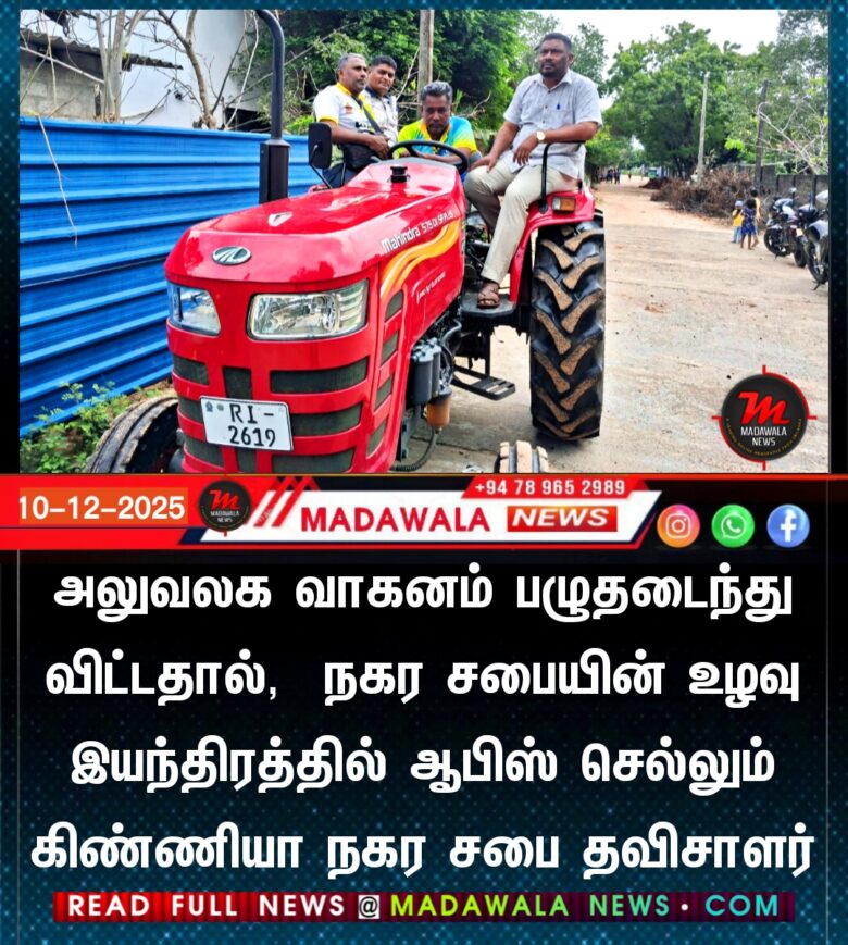 அலுவலக வாகனம் பழுதடைந்து விட்டதால், நகர சபையின் உழவு இயந்திரத்தில் சென்று கடமைகளை நிறைவேற்றி வரும் கிண்ணியா நகர சபை தவிசாளர்