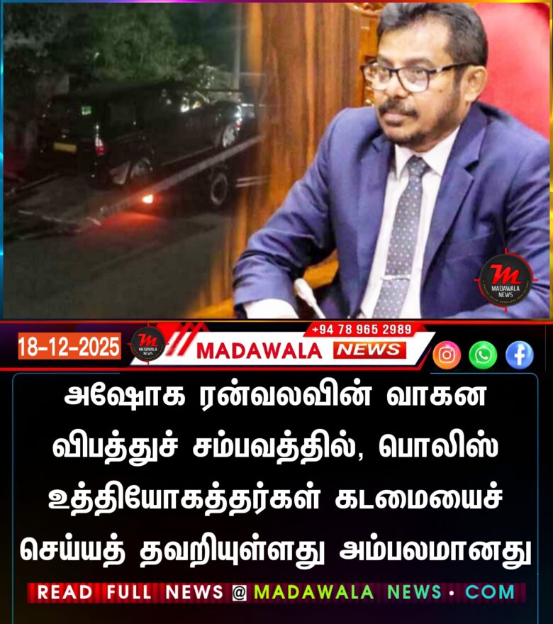 தேசிய மக்கள் சக்தியின் கம்பஹா மாவட்ட பாராளுமன்ற உறுப்பினர் அஷோக ரன்வலவின் வாகன விபத்துச் சம்பவத்தில், பொலிஸ் உத்தியோகத்தர்கள் கடமையைச் செய்யத் தவறியுள்ளமை அவதானிக்கப்பட்டுள்ளதாக பொலிஸார் தெரிவித்தனர்.