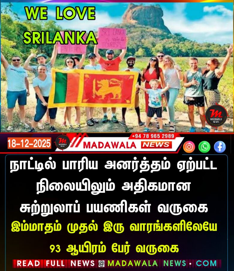 நாட்டில் பாரிய அனர்த்தம் ஏற்பட்ட நிலையிலும் அதிகமான சுற்றுலாப் பயணிகள் வருகை – இம்மாதம் முதல் இரு வாரங்களிலேயே 93 ஆயிரம் பேர் வருகை