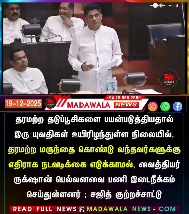தரமற்ற தடுப்பூசிகளை பயன்படுத்தியதால் இரு யுவதிகள் உயிரிழந்துள்ள நிலையில், தரமற்ற மருந்தை கொண்டு வந்தவர்களுக்கு எதிராக நடவடிக்கை எடுக்காமல், வைத்தியர் ருக்ஷான் பெல்லனவை பணி இடைநீக்கம் செய்துள்ளனர் ; சஜித் குற்றச்சாட்டு