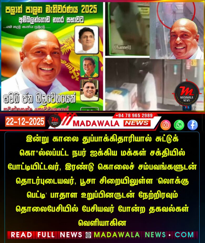 இன்று காலை துப்பாக்கிதாரியால் சுட்டுக் கொ*ல்லப்பட்ட நபர் ஐக்கிய மக்கள் சக்தியில் போட்டியிட்டவர், இரண்டு கொலைச் சம்பவங்களுடன் தொடர்புடையவர், பூசா சிறையிலுள்ள ‘லொக்கு பெட்டி’ பாதாள உறுப்பினருடன் நேற்றிரவும் தொலைபேசியில் பேசியவர் போன்ற தகவல்கள் வெளியாகின