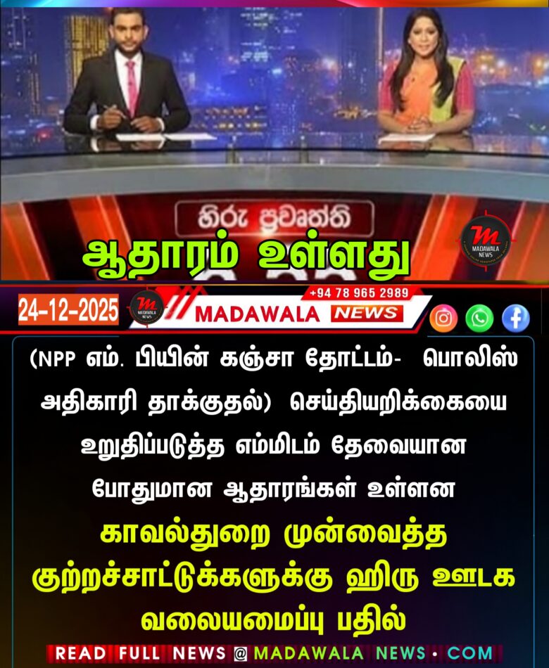 (NPP எம். பியின் கஞ்சா தோட்டம்- பொலிஸ் அதிகாரி தாக்குதல்) செய்தியறிக்கையை உறுதிப்படுத்த எம்மிடம் தேவையான போதுமான ஆதாரங்கள் உள்ளன – காவல்துறை முன்வைத்த குற்றச்சாட்டுக்களுக்கு ஹிரு ஊடக வலையமைப்பு பதில்