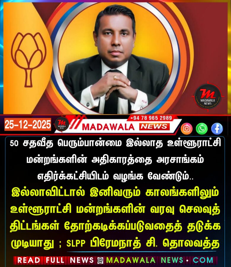 50 சதவீத பெரும்பான்மை இல்லாத உள்ளூராட்சி மன்றங்களின் அதிகாரத்தை அரசாங்கம் எதிர்க்கட்சியிடம் வழங்க வேண்டும்.. இல்லாவிட்டால் இனிவரும் காலங்களிலும் உள்ளூராட்சி மன்றங்களின் வரவு செலவுத் திட்டங்கள் தோற்கடிக்கப்படுவதைத் தடுக்க முடியாது ; SLPP பிரேமநாத் சி. தொலவத்த
