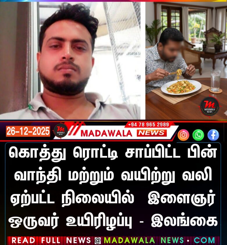 கொத்து ரொட்டி சாப்பிட்ட பின் வாந்தி மற்றும் வயிற்று வலி ஏற்பட்ட நிலையில் இளைஞர் ஒருவர் உயிரிழப்பு – இலங்கை