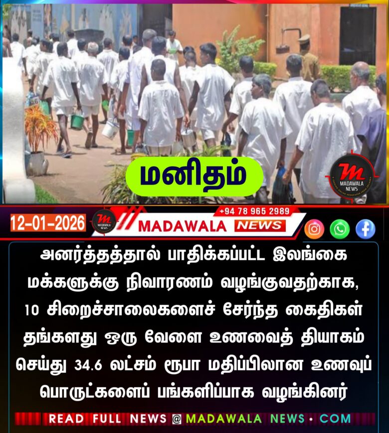 டிட்வா சூறாவளியால் பாதிக்கப்பட்டுள்ள மக்களுக்கு நிவாரணம் வழங்குவதற்காக, இலங்கையிலுள்ள 10 சிறைச்சாலைகளைச் சேர்ந்த கைதிகள் தங்களது ஒரு வேளை உணவைத் தியாகம் செய்து, 34.6 லட்சம் ரூபா மதிப்பிலான உணவுப் பொருட்களைப் பங்களிப்பாக வழங்கியுள்ளதாக சிறைச்சாலைத் திணைக்களம் தெரிவித்துள்ளது.