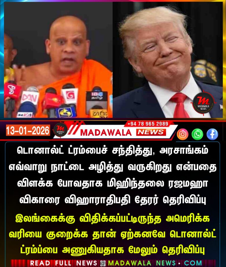 டொனால்ட் ட்ரம்பைச் சந்தித்து, அரசாங்கம் எவ்வாறு நாட்டை அழித்து வருகிறது என்பதை விளக்க போவதாக மிஹிந்தலை ரஜமஹா விகாரை விஹாராதிபதி தேரர் தெரிவிப்பு