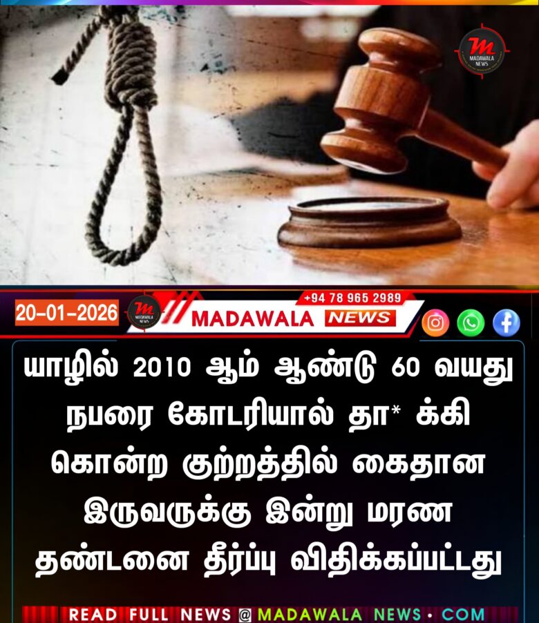 யாழில் 2010 ஆம் ஆண்டு 60 வயது நபரை கோடரியால் தா* க்கி கொன்ற குற்றத்தில் கைதான இருவருக்கு இன்று மரண தண்டனை தீர்ப்பு விதிக்கப்பட்டது