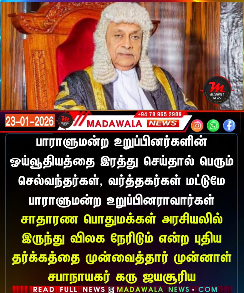 பாராளுமன்ற உறுப்பினர்களின் ஓய்வூதியத்தை இரத்து செய்தால் பெரும் செல்வந்தர்கள், வர்த்தகர்கள் மட்டுமே பாராளுமன்ற உறுப்பினராவார்கள் – சாதாரண பொதுமக்கள் அரசியலில் இருந்து விலக நேரிடும் என்ற புதிய தர்க்கத்தை முன்வைத்தார் முன்னாள் சபாநாயகர் கரு ஜயசூரிய