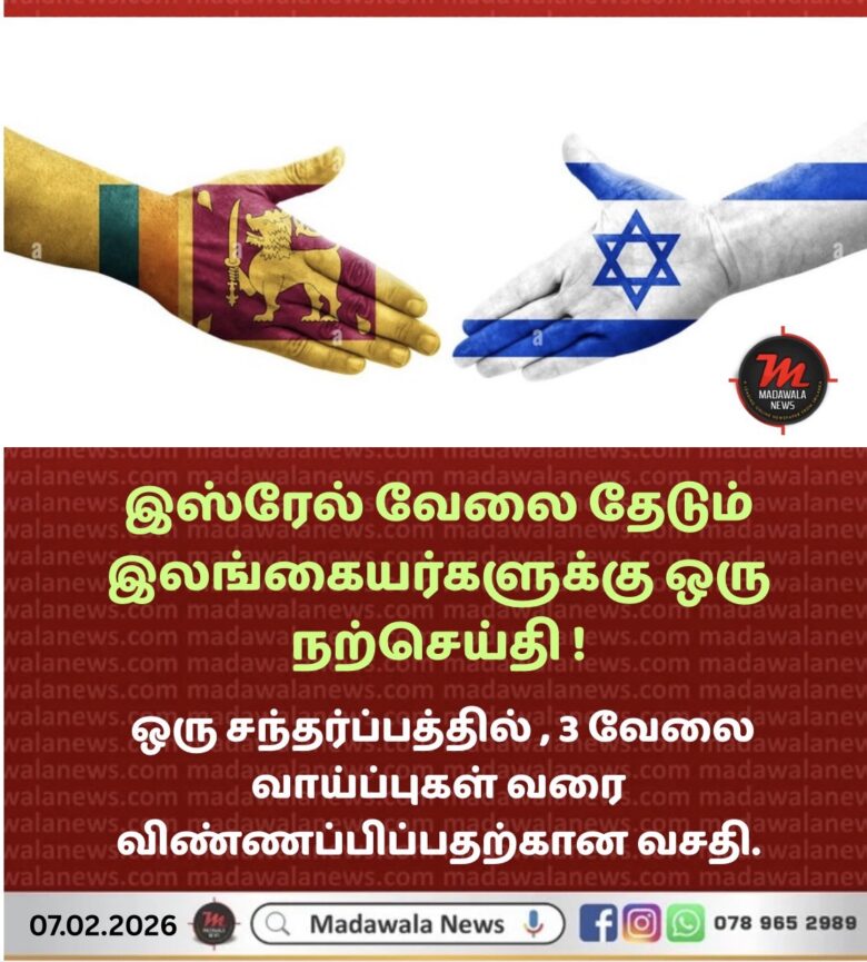 அதன்படி, இன்று (06) இஸ்ரேலில் நிலவும் சில வேலைவாய்ப்புகளுக்காக இணையதளம் ஊடாக விண்ணப்பிப்பதற்கான வாய்ப்புகள் திறந்து விடப்படும் என்றும் பணியகம் அறிவித்துள்ளது.