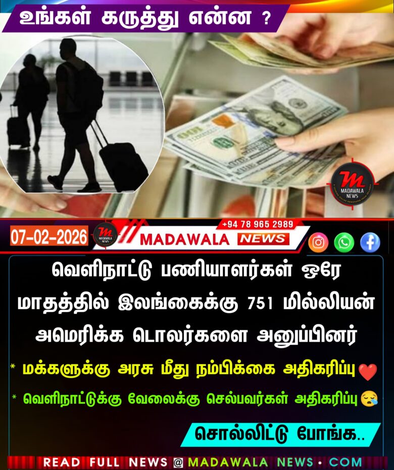 வெளிநாட்டு பணியாளர்கள் ஒரே மாதத்தில் இலங்கைக்கு 751 மில்லியன் அமெரிக்க டொலர்களை அனுப்பினர்