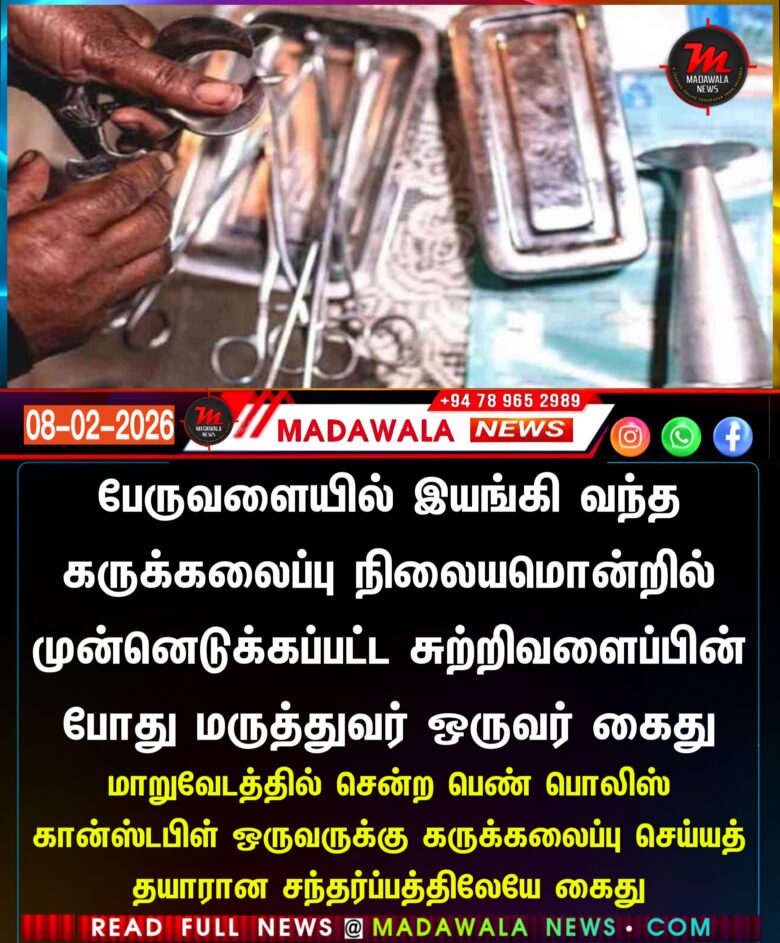 பேருவளையில் இயங்கி வந்த கருக்கலைப்பு நிலையமொன்றில் முன்னெடுக்கப்பட்ட சுற்றிவளைப்பின் போது மருத்துவர் ஒருவர் கைது