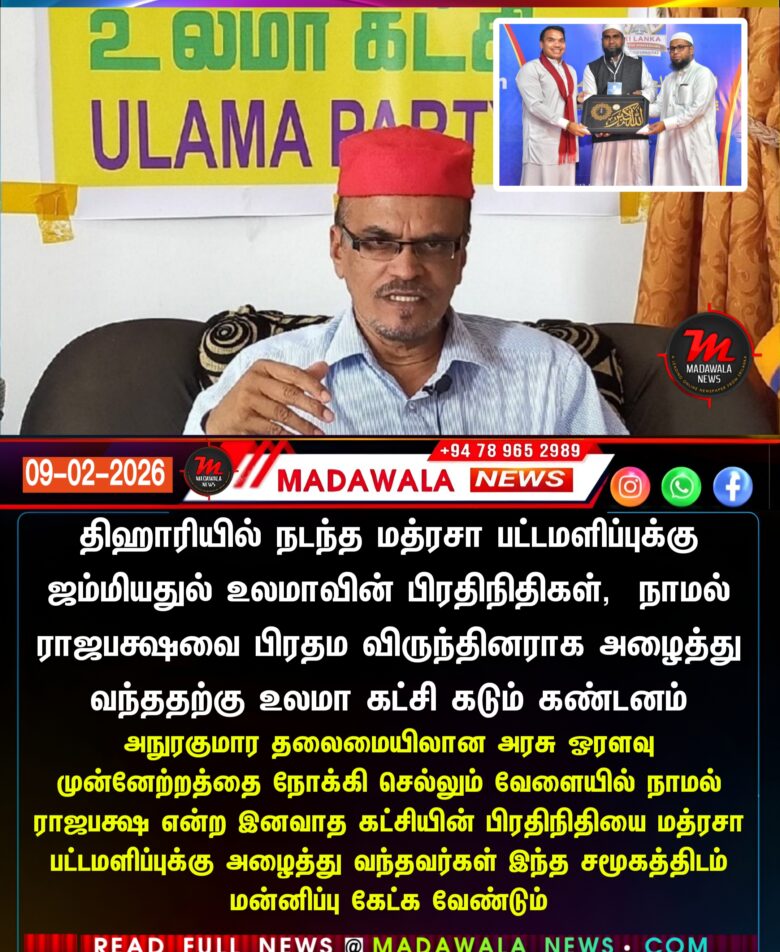 திஹாரியில் நடந்த மத்ரசா பட்டமளிப்புக்கு ஜம்மியதுல் உலமாவின் பிரதிநிதிகள், நாமல் ராஜபக்ஷவை பிரதம விருந்தினராக அழைத்து வந்ததற்கு உலமா கட்சி கடும் கண்டனம்
