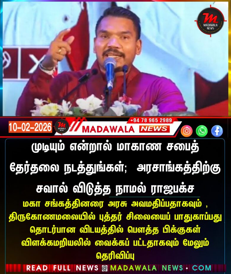 முடியும் என்றால் மாகாண சபைத் தேர்தலை நடத்துங்கள்; அரசாங்கத்திற்கு சவால் விடுத்த நாமல் ராஜபக்ச – மகா சங்கத்தினரை அரசு அவமதிப்பதாகவும் , திருகோணமலையில் புத்தர் சிலையைப் பாதுகாப்பது தொடர்பான விடயத்தில் பெளத்த பிக்குகள் விளக்கமறியலில் வைக்கப் பட்டதாகவும் மேலும் தெரிவிப்பு