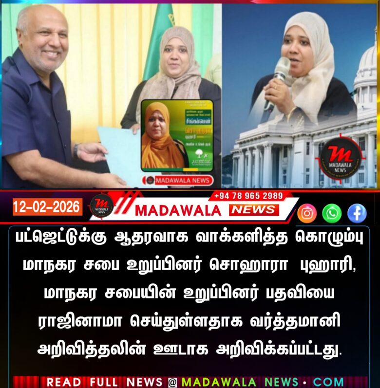 பட்ஜெட்டுக்கு ஆதரவாக வாக்களித்த கொழும்பு மாநகர சபை உறுப்பினர் சொஹாரா புஹாரி, மாநகர சபையின் உறுப்பினர் பதவியை ராஜினாமா செய்துள்ளதாக வர்த்தமானி அறிவித்தலின் ஊடாக அறிவிக்கப்பட்டது.